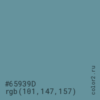 Цвет #65939D в цветовой модели RGB обозначается тремя октетами (101, 147, 157) в десятичном формате и #65939D в шестнадцатиричном (hex) формате, которые являются интенсивностью красного 101 (hex 65), интенсивность зелёного 147 (hex 93) и интенсивность синего 157 (hex 9D).