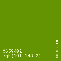 Цвет #659402 в цветовой модели RGB обозначается тремя октетами (101, 148, 2) в десятичном формате и #659402 в шестнадцатиричном (hex) формате, которые являются интенсивностью красного 101 (hex 65), интенсивность зелёного 148 (hex 94) и интенсивность синего 2 (hex 02).