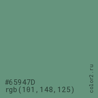 Цвет #65947D в цветовой модели RGB обозначается тремя октетами (101, 148, 125) в десятичном формате и #65947D в шестнадцатиричном (hex) формате, которые являются интенсивностью красного 101 (hex 65), интенсивность зелёного 148 (hex 94) и интенсивность синего 125 (hex 7D).