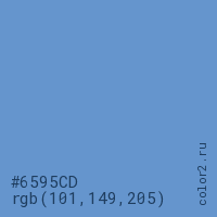 Цвет #6595CD в цветовой модели RGB обозначается тремя октетами (101, 149, 205) в десятичном формате и #6595CD в шестнадцатиричном (hex) формате, которые являются интенсивностью красного 101 (hex 65), интенсивность зелёного 149 (hex 95) и интенсивность синего 205 (hex CD).