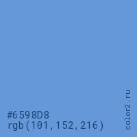 Цвет #6598D8 в цветовой модели RGB обозначается тремя октетами (101, 152, 216) в десятичном формате и #6598D8 в шестнадцатиричном (hex) формате, которые являются интенсивностью красного 101 (hex 65), интенсивность зелёного 152 (hex 98) и интенсивность синего 216 (hex D8).