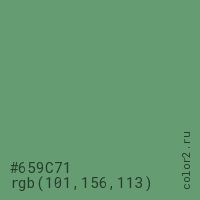 Цвет #659C71 в цветовой модели RGB обозначается тремя октетами (101, 156, 113) в десятичном формате и #659C71 в шестнадцатиричном (hex) формате, которые являются интенсивностью красного 101 (hex 65), интенсивность зелёного 156 (hex 9C) и интенсивность синего 113 (hex 71).