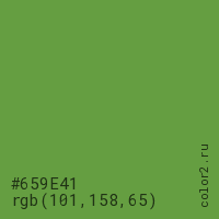 Цвет #659E41 в цветовой модели RGB обозначается тремя октетами (101, 158, 65) в десятичном формате и #659E41 в шестнадцатиричном (hex) формате, которые являются интенсивностью красного 101 (hex 65), интенсивность зелёного 158 (hex 9E) и интенсивность синего 65 (hex 41).