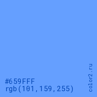 Цвет #659FFF в цветовой модели RGB обозначается тремя октетами (101, 159, 255) в десятичном формате и #659FFF в шестнадцатиричном (hex) формате, которые являются интенсивностью красного 101 (hex 65), интенсивность зелёного 159 (hex 9F) и интенсивность синего 255 (hex FF).