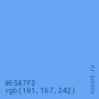 Цвет #65A7F2 в цветовой модели RGB обозначается тремя октетами (101, 167, 242) в десятичном формате и #65A7F2 в шестнадцатиричном (hex) формате, которые являются интенсивностью красного 101 (hex 65), интенсивность зелёного 167 (hex A7) и интенсивность синего 242 (hex F2).
