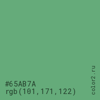 Цвет #65AB7A в цветовой модели RGB обозначается тремя октетами (101, 171, 122) в десятичном формате и #65AB7A в шестнадцатиричном (hex) формате, которые являются интенсивностью красного 101 (hex 65), интенсивность зелёного 171 (hex AB) и интенсивность синего 122 (hex 7A).
