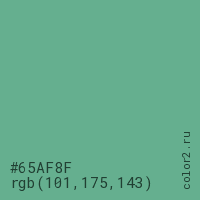 Цвет #65AF8F в цветовой модели RGB обозначается тремя октетами (101, 175, 143) в десятичном формате и #65AF8F в шестнадцатиричном (hex) формате, которые являются интенсивностью красного 101 (hex 65), интенсивность зелёного 175 (hex AF) и интенсивность синего 143 (hex 8F).