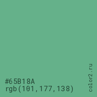 Цвет #65B18A в цветовой модели RGB обозначается тремя октетами (101, 177, 138) в десятичном формате и #65B18A в шестнадцатиричном (hex) формате, которые являются интенсивностью красного 101 (hex 65), интенсивность зелёного 177 (hex B1) и интенсивность синего 138 (hex 8A).