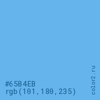 Цвет #65B4EB в цветовой модели RGB обозначается тремя октетами (101, 180, 235) в десятичном формате и #65B4EB в шестнадцатиричном (hex) формате, которые являются интенсивностью красного 101 (hex 65), интенсивность зелёного 180 (hex B4) и интенсивность синего 235 (hex EB).