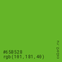 Цвет #65B528 в цветовой модели RGB обозначается тремя октетами (101, 181, 40) в десятичном формате и #65B528 в шестнадцатиричном (hex) формате, которые являются интенсивностью красного 101 (hex 65), интенсивность зелёного 181 (hex B5) и интенсивность синего 40 (hex 28).