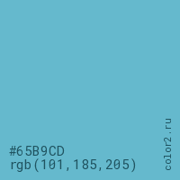 Цвет #65B9CD в цветовой модели RGB обозначается тремя октетами (101, 185, 205) в десятичном формате и #65B9CD в шестнадцатиричном (hex) формате, которые являются интенсивностью красного 101 (hex 65), интенсивность зелёного 185 (hex B9) и интенсивность синего 205 (hex CD).