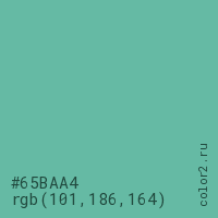 Цвет #65BAA4 в цветовой модели RGB обозначается тремя октетами (101, 186, 164) в десятичном формате и #65BAA4 в шестнадцатиричном (hex) формате, которые являются интенсивностью красного 101 (hex 65), интенсивность зелёного 186 (hex BA) и интенсивность синего 164 (hex A4).
