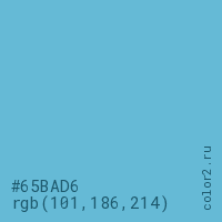 Цвет #65BAD6 в цветовой модели RGB обозначается тремя октетами (101, 186, 214) в десятичном формате и #65BAD6 в шестнадцатиричном (hex) формате, которые являются интенсивностью красного 101 (hex 65), интенсивность зелёного 186 (hex BA) и интенсивность синего 214 (hex D6).