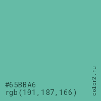 Цвет #65BBA6 в цветовой модели RGB обозначается тремя октетами (101, 187, 166) в десятичном формате и #65BBA6 в шестнадцатиричном (hex) формате, которые являются интенсивностью красного 101 (hex 65), интенсивность зелёного 187 (hex BB) и интенсивность синего 166 (hex A6).
