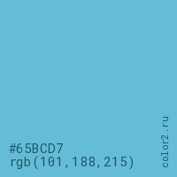 Цвет #65BCD7 в цветовой модели RGB обозначается тремя октетами (101, 188, 215) в десятичном формате и #65BCD7 в шестнадцатиричном (hex) формате, которые являются интенсивностью красного 101 (hex 65), интенсивность зелёного 188 (hex BC) и интенсивность синего 215 (hex D7).