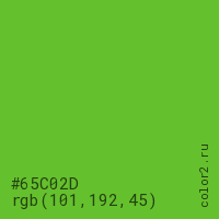 Цвет #65C02D в цветовой модели RGB обозначается тремя октетами (101, 192, 45) в десятичном формате и #65C02D в шестнадцатиричном (hex) формате, которые являются интенсивностью красного 101 (hex 65), интенсивность зелёного 192 (hex C0) и интенсивность синего 45 (hex 2D).