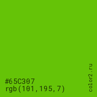 Цвет #65C307 в цветовой модели RGB обозначается тремя октетами (101, 195, 7) в десятичном формате и #65C307 в шестнадцатиричном (hex) формате, которые являются интенсивностью красного 101 (hex 65), интенсивность зелёного 195 (hex C3) и интенсивность синего 7 (hex 07).
