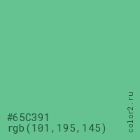 Цвет #65C391 в цветовой модели RGB обозначается тремя октетами (101, 195, 145) в десятичном формате и #65C391 в шестнадцатиричном (hex) формате, которые являются интенсивностью красного 101 (hex 65), интенсивность зелёного 195 (hex C3) и интенсивность синего 145 (hex 91).