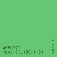 Цвет #65C771 в цветовой модели RGB обозначается тремя октетами (101, 199, 113) в десятичном формате и #65C771 в шестнадцатиричном (hex) формате, которые являются интенсивностью красного 101 (hex 65), интенсивность зелёного 199 (hex C7) и интенсивность синего 113 (hex 71).