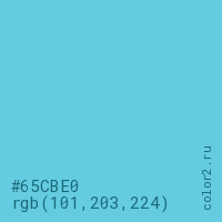 Цвет #65CBE0 в цветовой модели RGB обозначается тремя октетами (101, 203, 224) в десятичном формате и #65CBE0 в шестнадцатиричном (hex) формате, которые являются интенсивностью красного 101 (hex 65), интенсивность зелёного 203 (hex CB) и интенсивность синего 224 (hex E0).