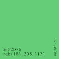 Цвет #65CD75 в цветовой модели RGB обозначается тремя октетами (101, 205, 117) в десятичном формате и #65CD75 в шестнадцатиричном (hex) формате, которые являются интенсивностью красного 101 (hex 65), интенсивность зелёного 205 (hex CD) и интенсивность синего 117 (hex 75).