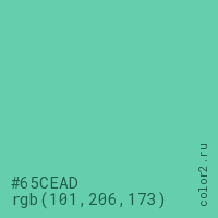 Цвет #65CEAD в цветовой модели RGB обозначается тремя октетами (101, 206, 173) в десятичном формате и #65CEAD в шестнадцатиричном (hex) формате, которые являются интенсивностью красного 101 (hex 65), интенсивность зелёного 206 (hex CE) и интенсивность синего 173 (hex AD).