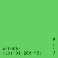 Цвет #65D062 в цветовой модели RGB обозначается тремя октетами (101, 208, 98) в десятичном формате и #65D062 в шестнадцатиричном (hex) формате, которые являются интенсивностью красного 101 (hex 65), интенсивность зелёного 208 (hex D0) и интенсивность синего 98 (hex 62).