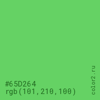 Цвет #65D264 в цветовой модели RGB обозначается тремя октетами (101, 210, 100) в десятичном формате и #65D264 в шестнадцатиричном (hex) формате, которые являются интенсивностью красного 101 (hex 65), интенсивность зелёного 210 (hex D2) и интенсивность синего 100 (hex 64).