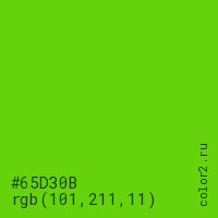 Цвет #65D30B в цветовой модели RGB обозначается тремя октетами (101, 211, 11) в десятичном формате и #65D30B в шестнадцатиричном (hex) формате, которые являются интенсивностью красного 101 (hex 65), интенсивность зелёного 211 (hex D3) и интенсивность синего 11 (hex 0B).