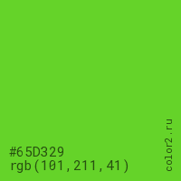 Цвет #65D329 в цветовой модели RGB обозначается тремя октетами (101, 211, 41) в десятичном формате и #65D329 в шестнадцатиричном (hex) формате, которые являются интенсивностью красного 101 (hex 65), интенсивность зелёного 211 (hex D3) и интенсивность синего 41 (hex 29).