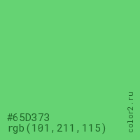 Цвет #65D373 в цветовой модели RGB обозначается тремя октетами (101, 211, 115) в десятичном формате и #65D373 в шестнадцатиричном (hex) формате, которые являются интенсивностью красного 101 (hex 65), интенсивность зелёного 211 (hex D3) и интенсивность синего 115 (hex 73).