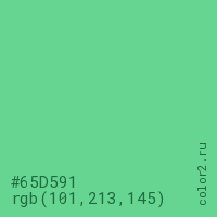 Цвет #65D591 в цветовой модели RGB обозначается тремя октетами (101, 213, 145) в десятичном формате и #65D591 в шестнадцатиричном (hex) формате, которые являются интенсивностью красного 101 (hex 65), интенсивность зелёного 213 (hex D5) и интенсивность синего 145 (hex 91).