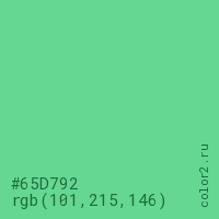 Цвет #65D792 в цветовой модели RGB обозначается тремя октетами (101, 215, 146) в десятичном формате и #65D792 в шестнадцатиричном (hex) формате, которые являются интенсивностью красного 101 (hex 65), интенсивность зелёного 215 (hex D7) и интенсивность синего 146 (hex 92).