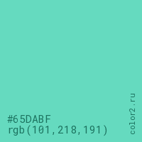 Цвет #65DABF в цветовой модели RGB обозначается тремя октетами (101, 218, 191) в десятичном формате и #65DABF в шестнадцатиричном (hex) формате, которые являются интенсивностью красного 101 (hex 65), интенсивность зелёного 218 (hex DA) и интенсивность синего 191 (hex BF).