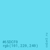 Цвет #65DCF0 в цветовой модели RGB обозначается тремя октетами (101, 220, 240) в десятичном формате и #65DCF0 в шестнадцатиричном (hex) формате, которые являются интенсивностью красного 101 (hex 65), интенсивность зелёного 220 (hex DC) и интенсивность синего 240 (hex F0).
