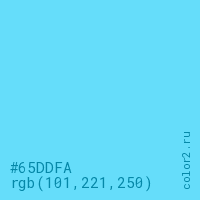Цвет #65DDFA в цветовой модели RGB обозначается тремя октетами (101, 221, 250) в десятичном формате и #65DDFA в шестнадцатиричном (hex) формате, которые являются интенсивностью красного 101 (hex 65), интенсивность зелёного 221 (hex DD) и интенсивность синего 250 (hex FA).