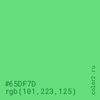 Цвет #65DF7D в цветовой модели RGB обозначается тремя октетами (101, 223, 125) в десятичном формате и #65DF7D в шестнадцатиричном (hex) формате, которые являются интенсивностью красного 101 (hex 65), интенсивность зелёного 223 (hex DF) и интенсивность синего 125 (hex 7D).