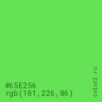 Цвет #65E256 в цветовой модели RGB обозначается тремя октетами (101, 226, 86) в десятичном формате и #65E256 в шестнадцатиричном (hex) формате, которые являются интенсивностью красного 101 (hex 65), интенсивность зелёного 226 (hex E2) и интенсивность синего 86 (hex 56).