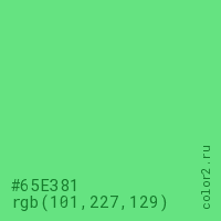 Цвет #65E381 в цветовой модели RGB обозначается тремя октетами (101, 227, 129) в десятичном формате и #65E381 в шестнадцатиричном (hex) формате, которые являются интенсивностью красного 101 (hex 65), интенсивность зелёного 227 (hex E3) и интенсивность синего 129 (hex 81).