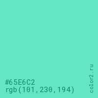 Цвет #65E6C2 в цветовой модели RGB обозначается тремя октетами (101, 230, 194) в десятичном формате и #65E6C2 в шестнадцатиричном (hex) формате, которые являются интенсивностью красного 101 (hex 65), интенсивность зелёного 230 (hex E6) и интенсивность синего 194 (hex C2).