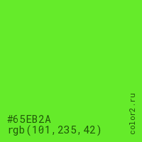 Цвет #65EB2A в цветовой модели RGB обозначается тремя октетами (101, 235, 42) в десятичном формате и #65EB2A в шестнадцатиричном (hex) формате, которые являются интенсивностью красного 101 (hex 65), интенсивность зелёного 235 (hex EB) и интенсивность синего 42 (hex 2A).