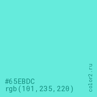 Цвет #65EBDC в цветовой модели RGB обозначается тремя октетами (101, 235, 220) в десятичном формате и #65EBDC в шестнадцатиричном (hex) формате, которые являются интенсивностью красного 101 (hex 65), интенсивность зелёного 235 (hex EB) и интенсивность синего 220 (hex DC).