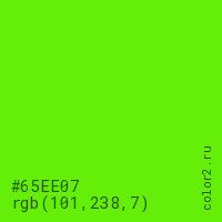 Цвет #65EE07 в цветовой модели RGB обозначается тремя октетами (101, 238, 7) в десятичном формате и #65EE07 в шестнадцатиричном (hex) формате, которые являются интенсивностью красного 101 (hex 65), интенсивность зелёного 238 (hex EE) и интенсивность синего 7 (hex 07).