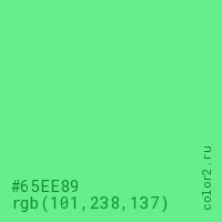 Цвет #65EE89 в цветовой модели RGB обозначается тремя октетами (101, 238, 137) в десятичном формате и #65EE89 в шестнадцатиричном (hex) формате, которые являются интенсивностью красного 101 (hex 65), интенсивность зелёного 238 (hex EE) и интенсивность синего 137 (hex 89).