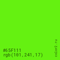 Цвет #65F111 в цветовой модели RGB обозначается тремя октетами (101, 241, 17) в десятичном формате и #65F111 в шестнадцатиричном (hex) формате, которые являются интенсивностью красного 101 (hex 65), интенсивность зелёного 241 (hex F1) и интенсивность синего 17 (hex 11).