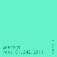 Цвет #65F2C9 в цветовой модели RGB обозначается тремя октетами (101, 242, 201) в десятичном формате и #65F2C9 в шестнадцатиричном (hex) формате, которые являются интенсивностью красного 101 (hex 65), интенсивность зелёного 242 (hex F2) и интенсивность синего 201 (hex C9).