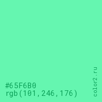 Цвет #65F6B0 в цветовой модели RGB обозначается тремя октетами (101, 246, 176) в десятичном формате и #65F6B0 в шестнадцатиричном (hex) формате, которые являются интенсивностью красного 101 (hex 65), интенсивность зелёного 246 (hex F6) и интенсивность синего 176 (hex B0).