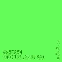Цвет #65FA54 в цветовой модели RGB обозначается тремя октетами (101, 250, 84) в десятичном формате и #65FA54 в шестнадцатиричном (hex) формате, которые являются интенсивностью красного 101 (hex 65), интенсивность зелёного 250 (hex FA) и интенсивность синего 84 (hex 54).