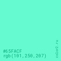Цвет #65FACF в цветовой модели RGB обозначается тремя октетами (101, 250, 207) в десятичном формате и #65FACF в шестнадцатиричном (hex) формате, которые являются интенсивностью красного 101 (hex 65), интенсивность зелёного 250 (hex FA) и интенсивность синего 207 (hex CF).