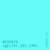 Цвет #65FBF9 в цветовой модели RGB обозначается тремя октетами (101, 251, 249) в десятичном формате и #65FBF9 в шестнадцатиричном (hex) формате, которые являются интенсивностью красного 101 (hex 65), интенсивность зелёного 251 (hex FB) и интенсивность синего 249 (hex F9).